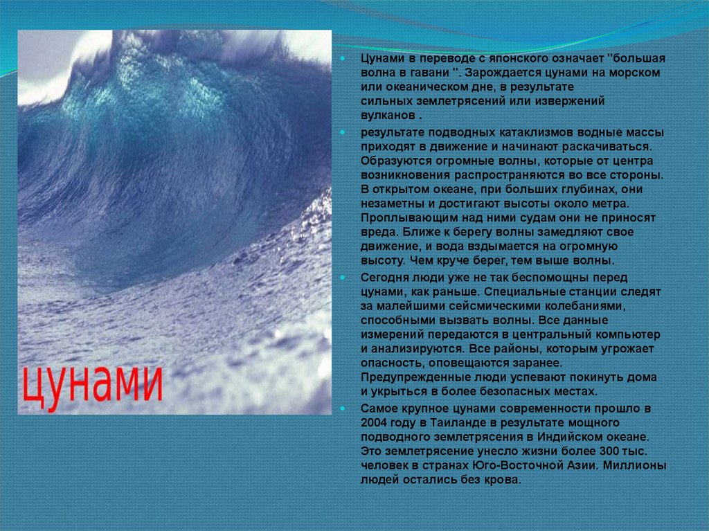 Цунами в переводе с японского означает "большаяволна в гавани ". Зарождается цунами на морском