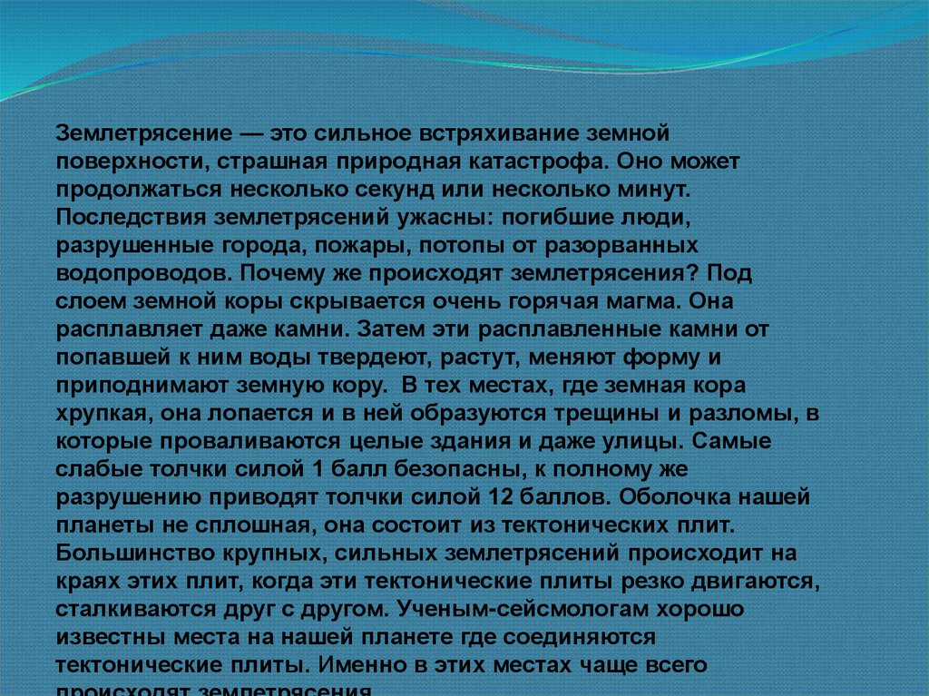 Землетрясение — это сильное встряхивание земнойповерхности, страшная природная катастрофа. Оно может
