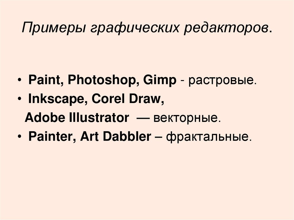 • Paint, Photoshop, Gimp - растровые.• Inkscape, Corel Draw,
