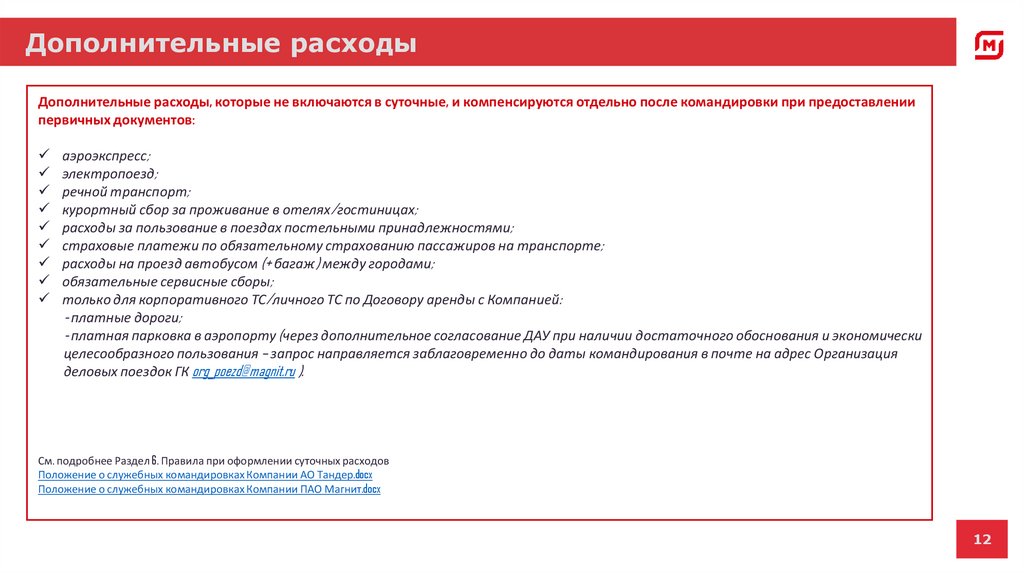 Дополнительные расходы, которые не включаются в суточные, и компенсируются отдельно после командировки при предоставлениипервичных документов:
