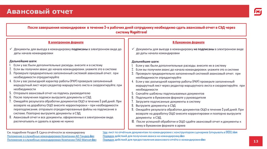После завершения командировки в течение 3-х рабочих дней сотруднику необходимо сдать авансовый отчет в СЭД черезсистему Magnittravel