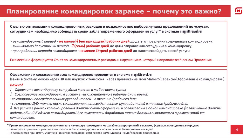 С целью оптимизации командировочных расходов и возможностью выбора лучших предложений по услугам,сотрудникам необходимо соблюдать сроки заблаговременного оформления услуг* в системе magnittravel.ru: