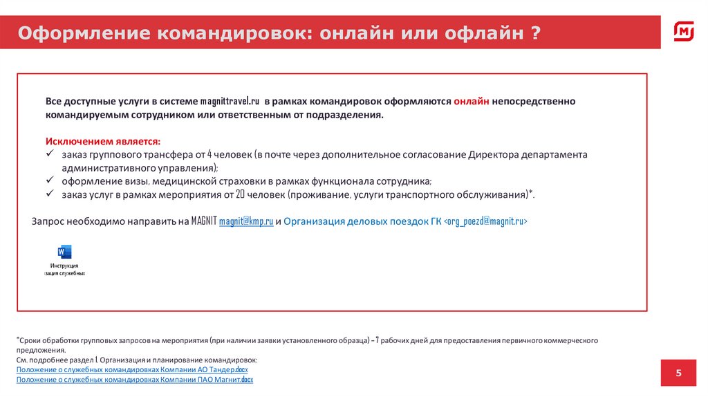 Все доступные услуги в системе magnittravel.ru в рамках командировок оформляются онлайн непосредственнокомандируемым сотрудником или ответственным от подразделения.