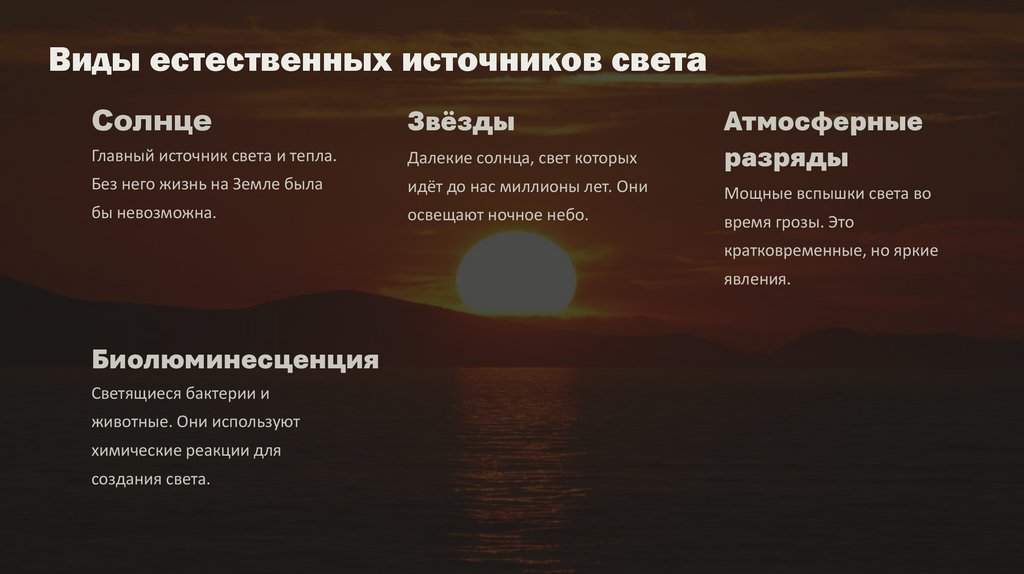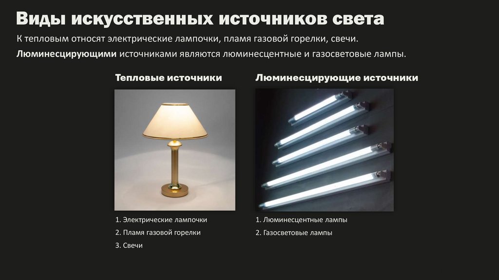 Виды искусственных источников светаК тепловым относят электрические лампочки, пламя газовой горелки, свечи.