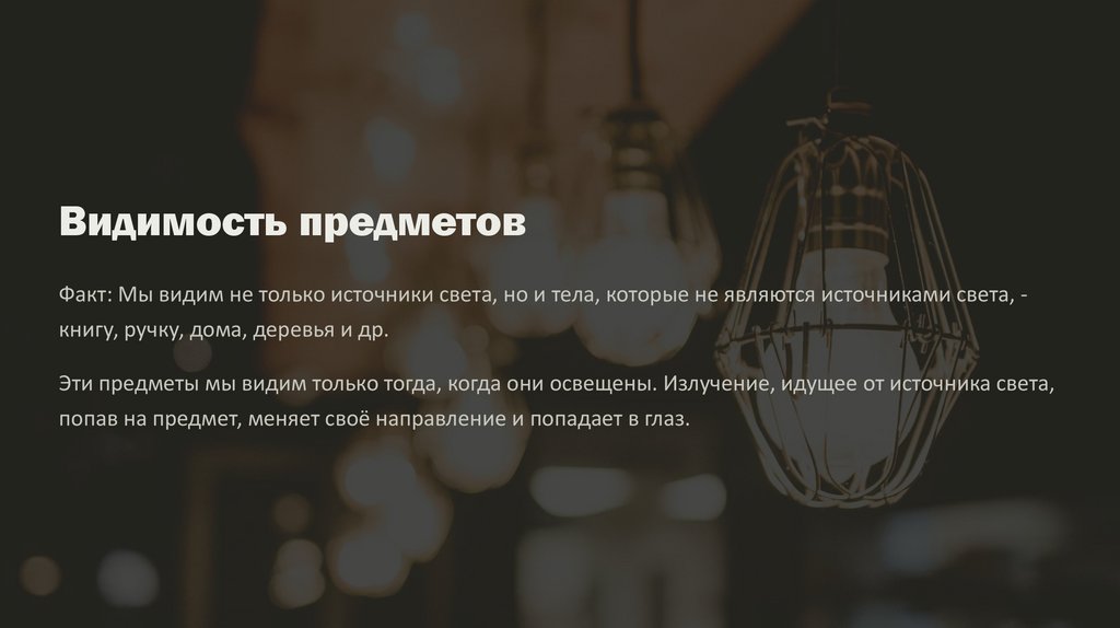 Видимость предметовФакт: Мы видим не только источники света, но и тела, которые не являются источниками света, книгу, ручку, дома, деревья и др.