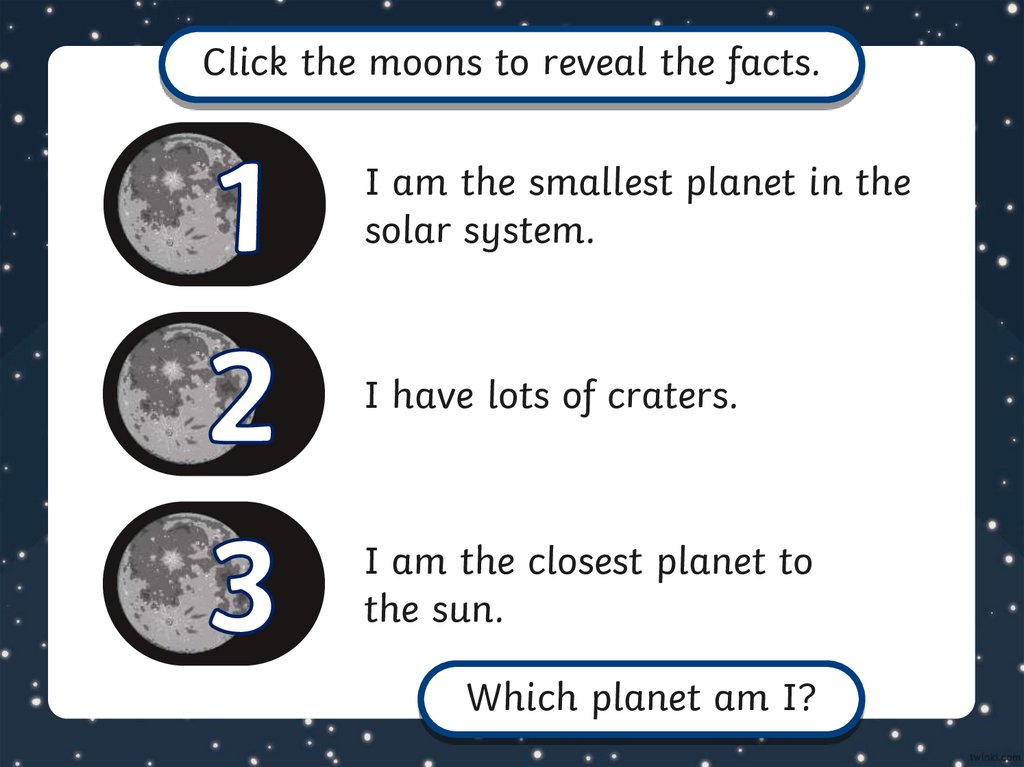 Click the moons to reveal the facts.I am the smallest planet in the