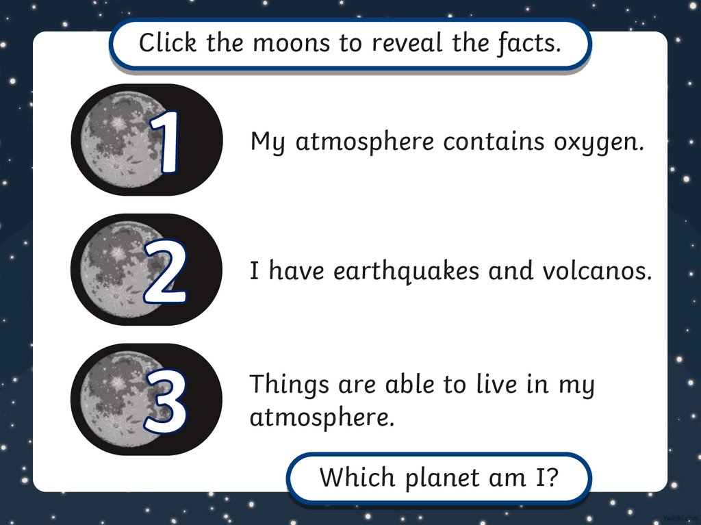 Click the moons to reveal the facts.My atmosphere contains oxygen.