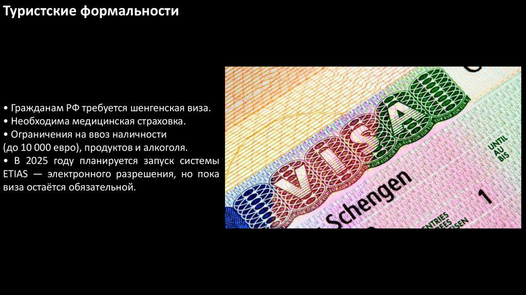 Туристские формальности• Гражданам РФ требуется шенгенская виза.