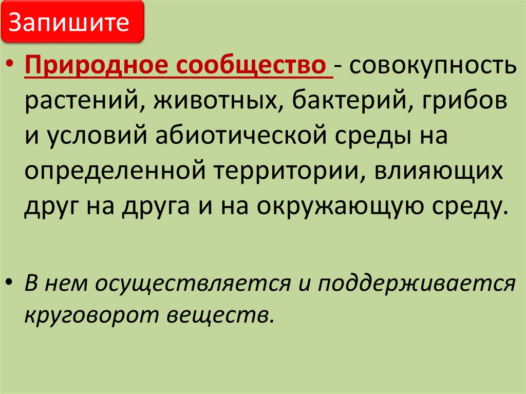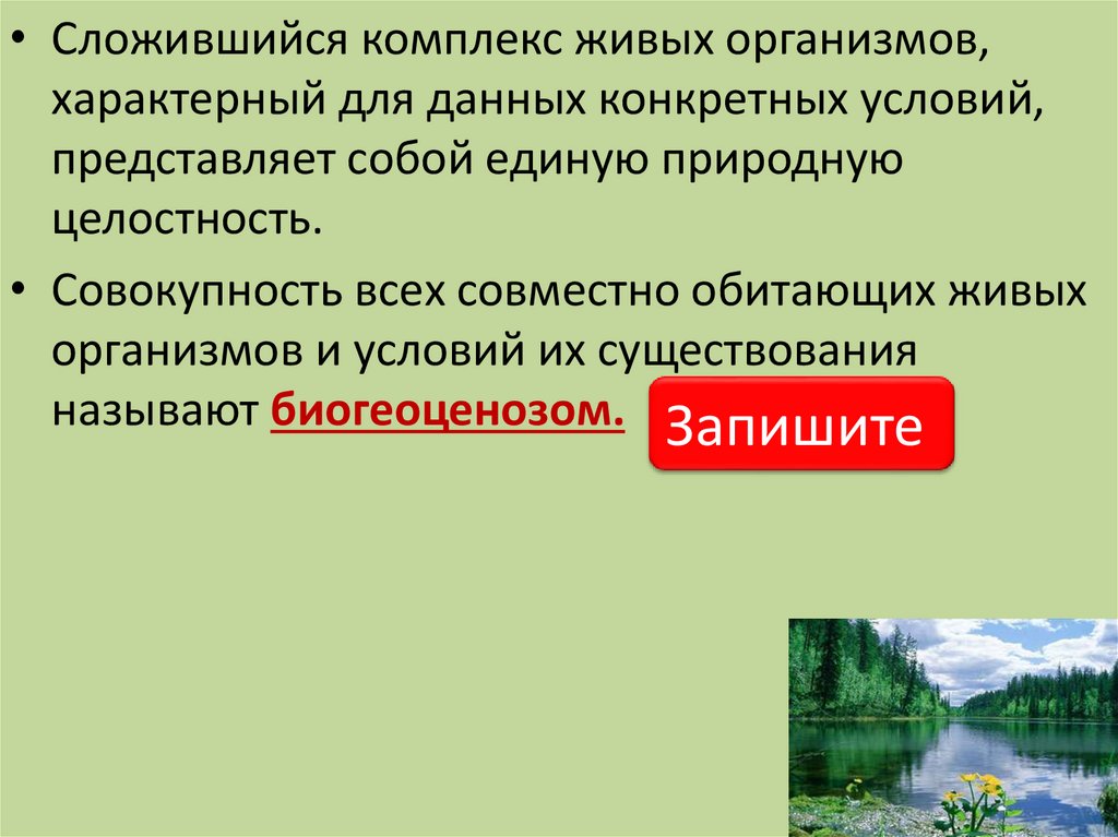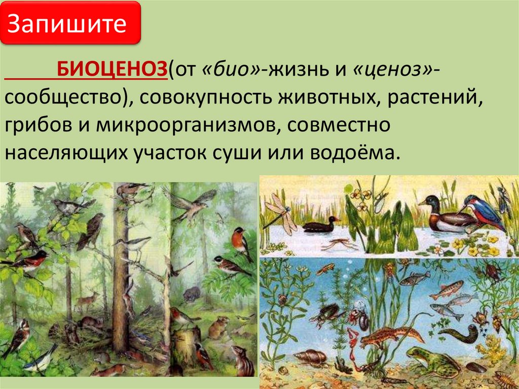 ЗапишитеБИОЦЕНОЗ(от «био»-жизнь и «ценоз»сообщество), совокупность животных, растений,