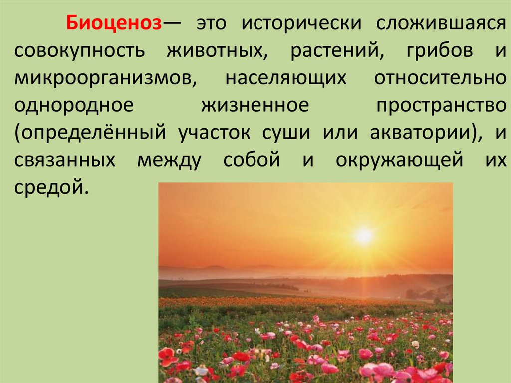 Биоценоз— это исторически сложившаясясовокупность животных, растений, грибов и