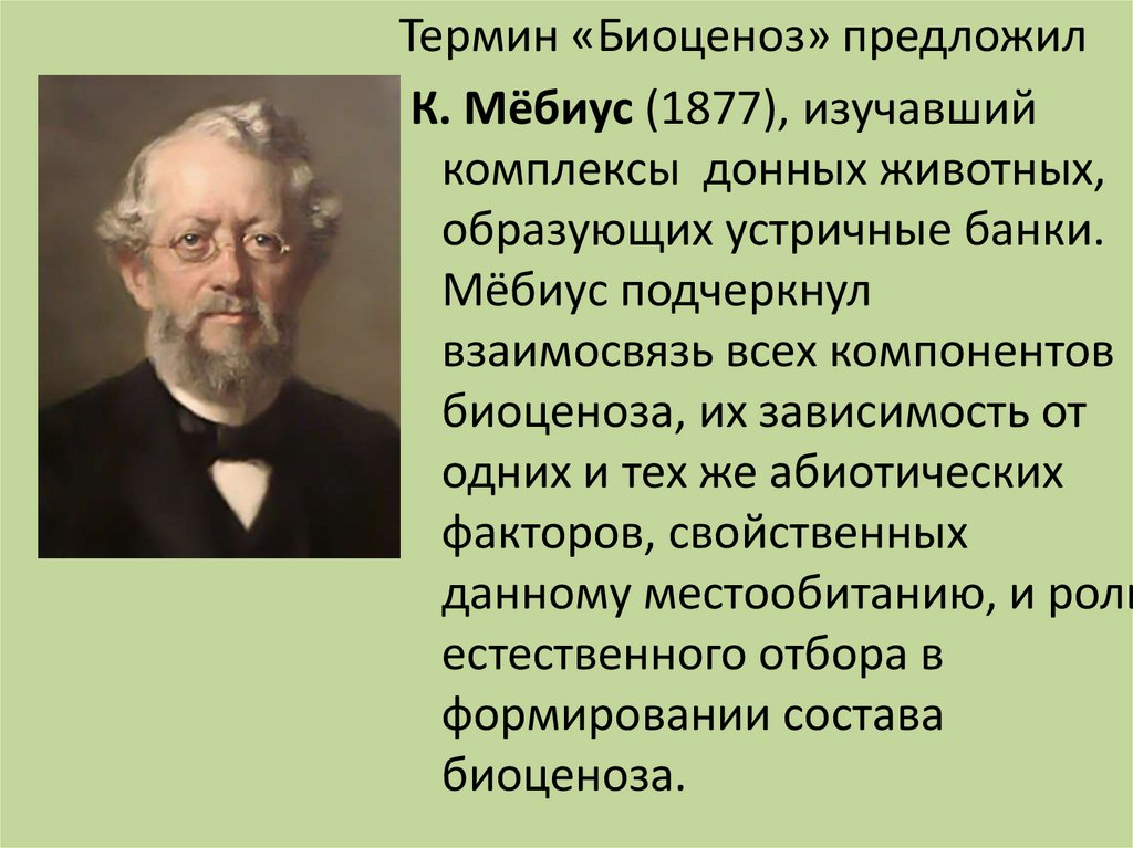 Термин «Биоценоз» предложилК. Мёбиус (1877), изучавший