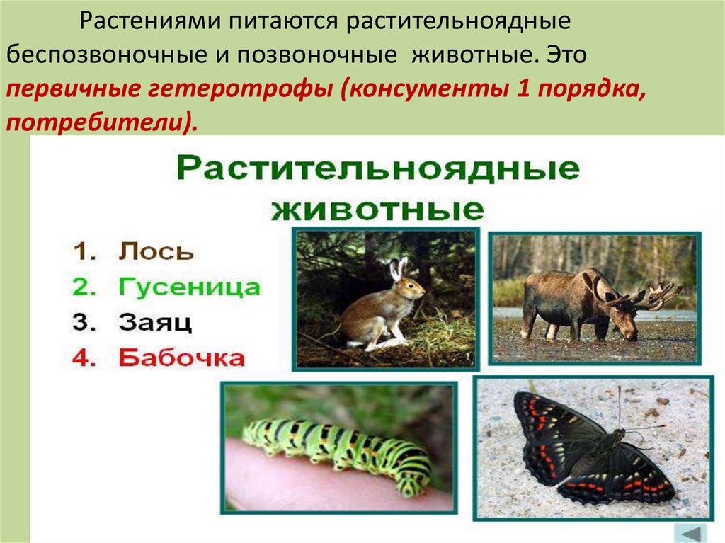 Растениями питаются растительноядныебеспозвоночные и позвоночные животные. Это