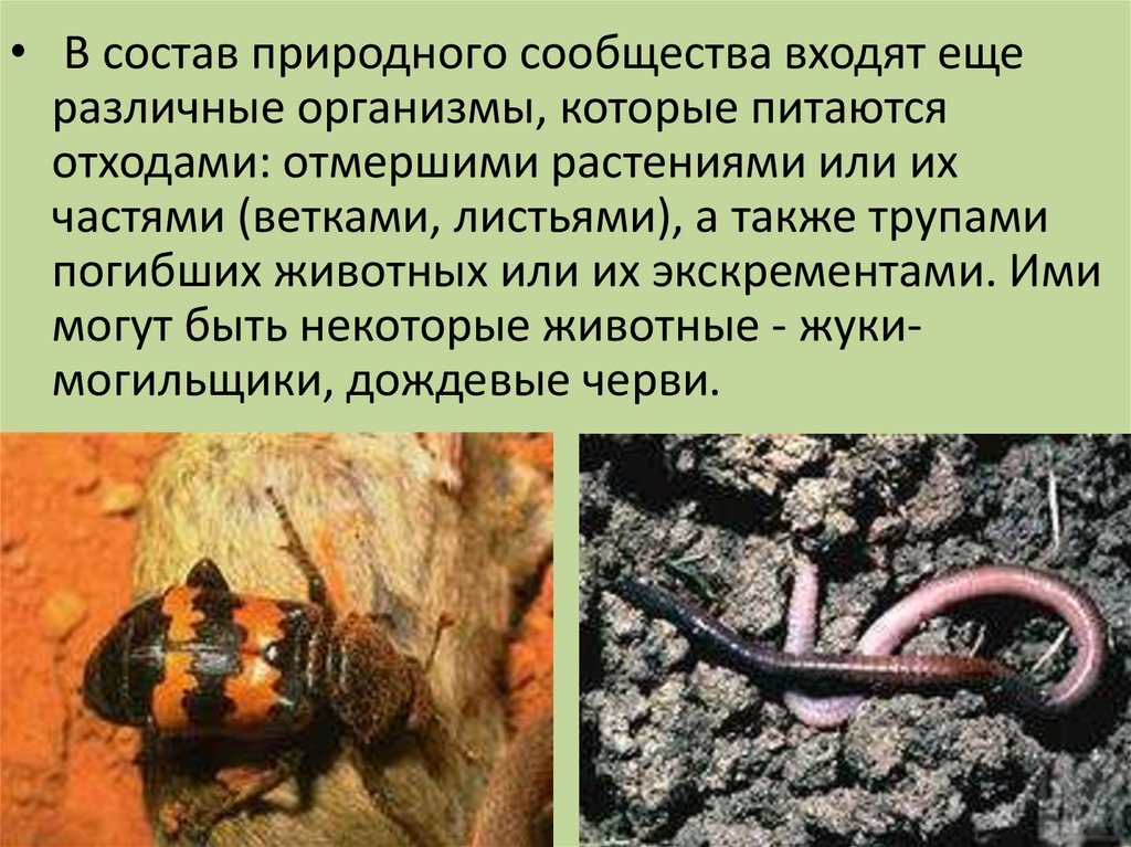 • В состав природного сообщества входят ещеразличные организмы, которые питаются