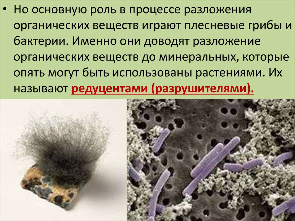 • Но основную роль в процессе разложенияорганических веществ играют плесневые грибы и