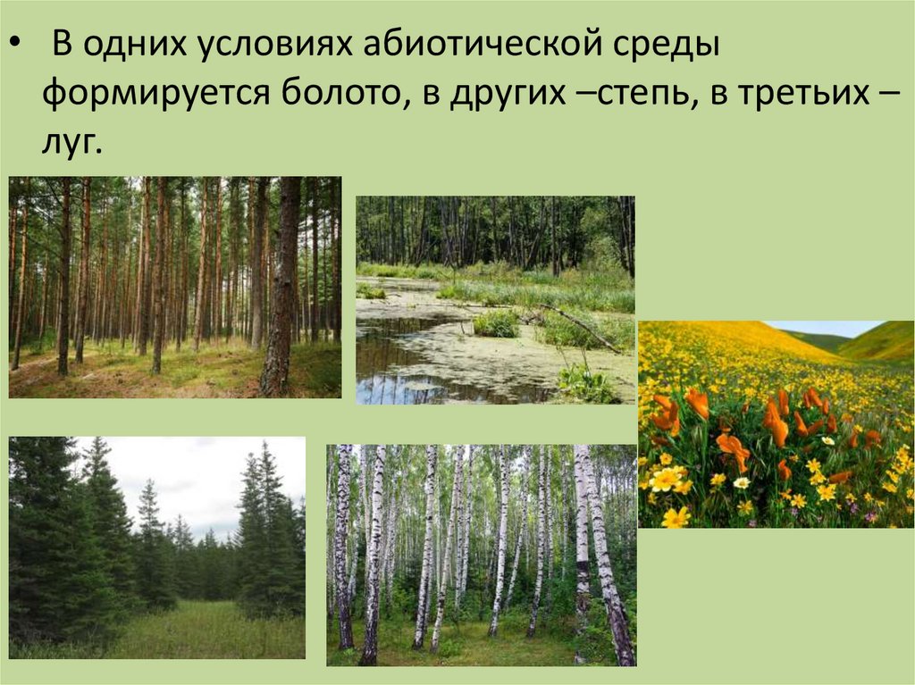 • В одних условиях абиотической средыформируется болото, в других –степь, в третьих –