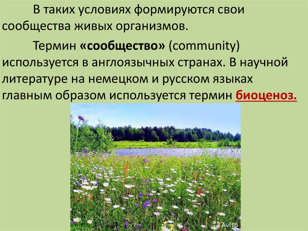 • Сложившийся комплекс живых организмов,характерный для данных конкретных условий,