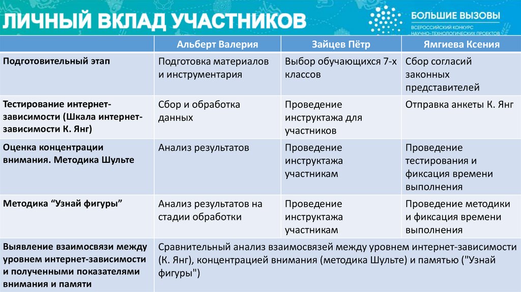 (Шкала интернет-зависимости К. Янг), концентрации внимания (Методика Шульте) и