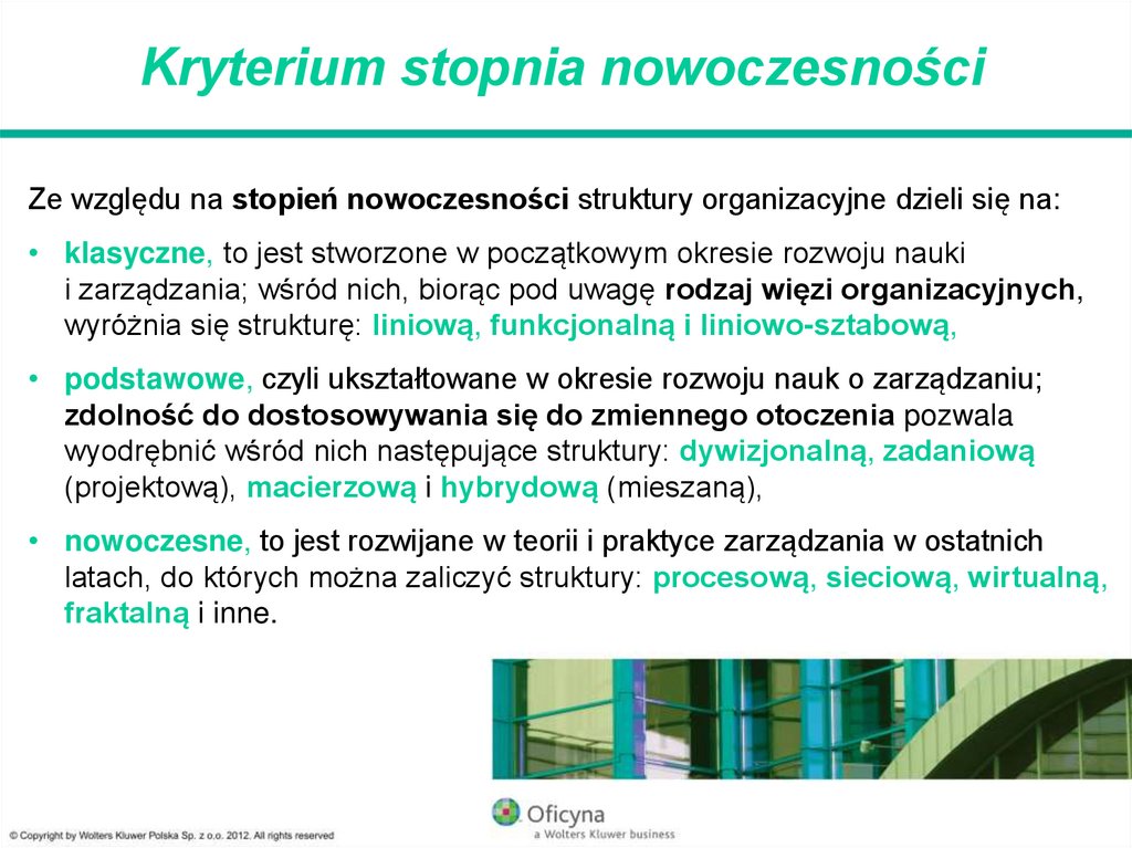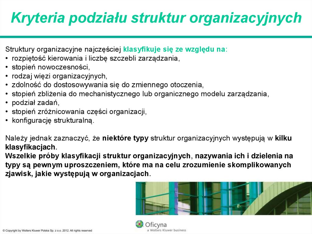 Kryteria podziału struktur organizacyjnychStruktury organizacyjne najczęściej klasyfikuje się ze względu na: