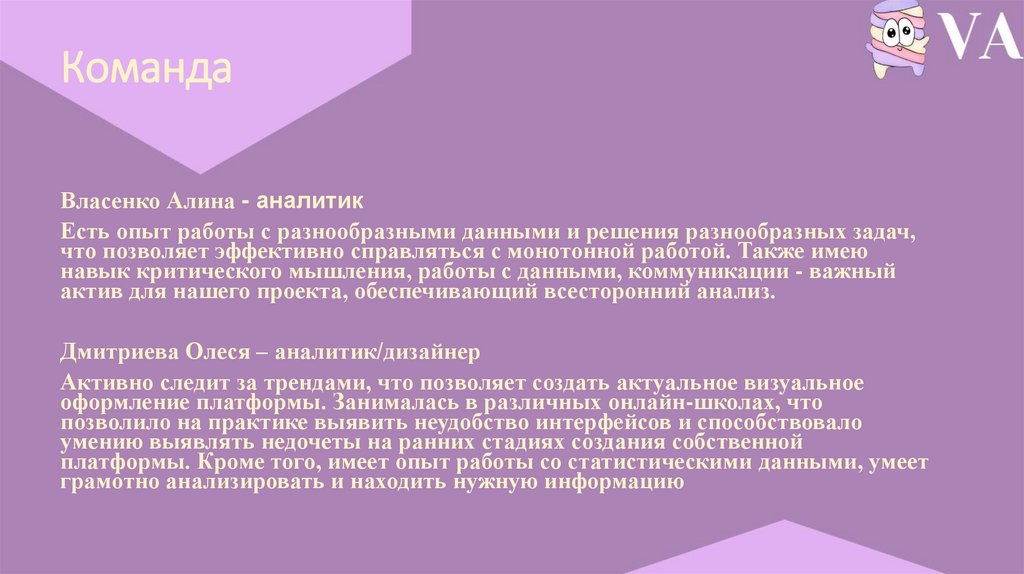 Власенко Алина - аналитикЕсть опыт работы с разнообразными данными и решения разнообразных задач,