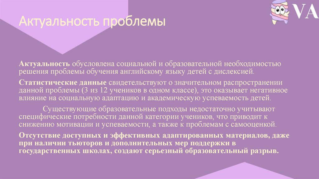 Актуальность обусловлена социальной и образовательной необходимостьюрешения проблемы обучения английскому языку детей с дислексией.