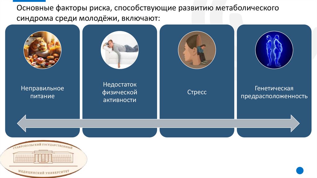 Основные факторы риска, способствующие развитию метаболическогосиндрома среди молодёжи, включают: