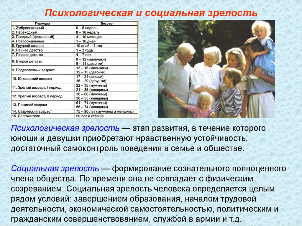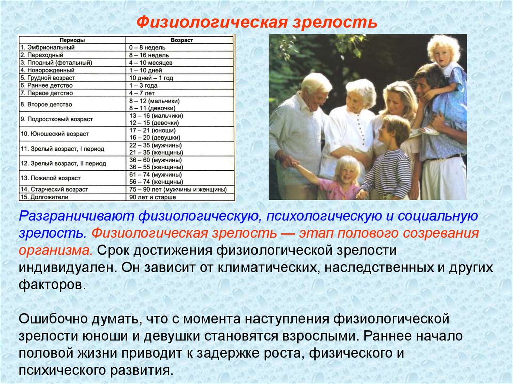 Физиологическая зрелостьРазграничивают физиологическую, психологическую и социальную