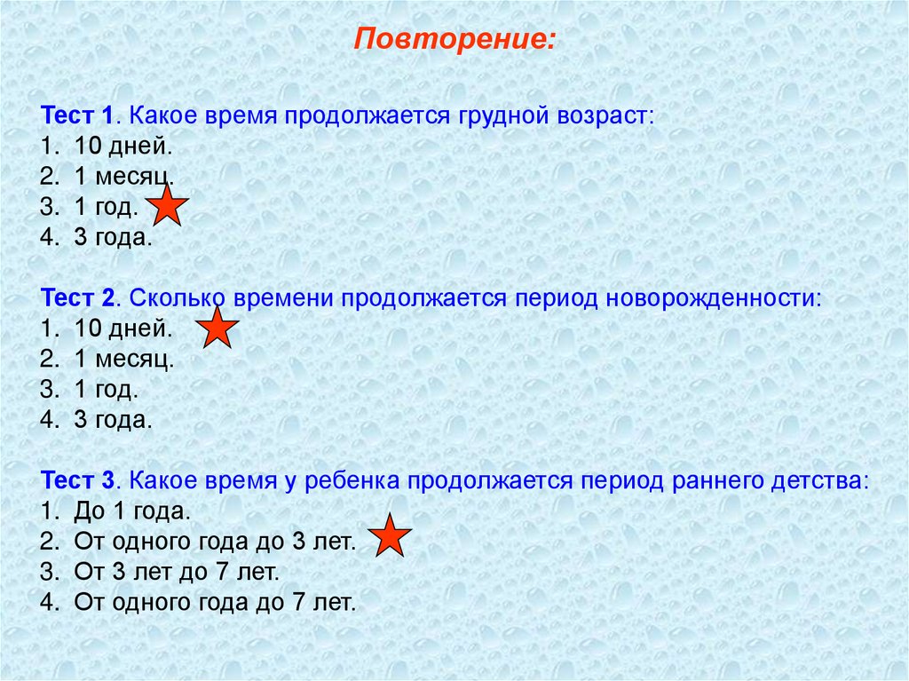 Повторение:Тест 1. Какое время продолжается грудной возраст: