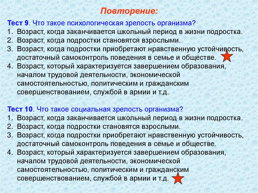 Повторение:Тест 9. Что такое психологическая зрелость организма?