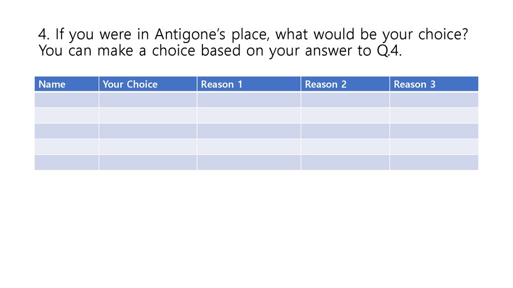 4. If you were in Antigone’s place, what would be your choice?You can make a choice based on your answer to Q.4.