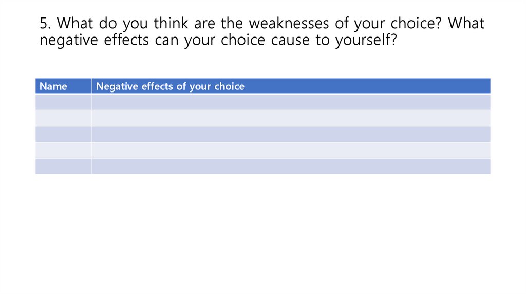 5. What do you think are the weaknesses of your choice? Whatnegative effects can your choice cause to yourself?