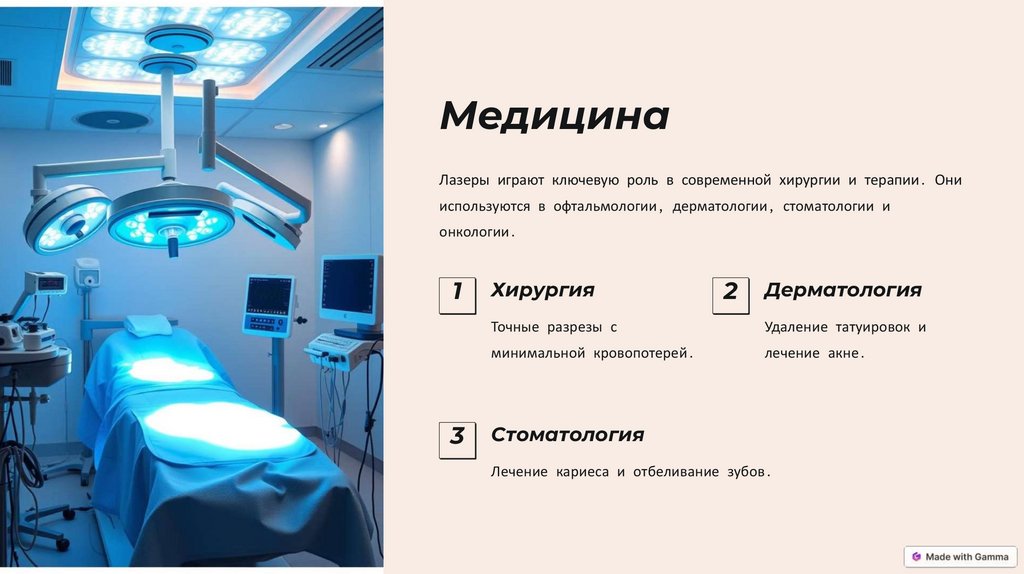МедицинаЛазеры играют ключевую роль в современной хирургии и терапии. Они