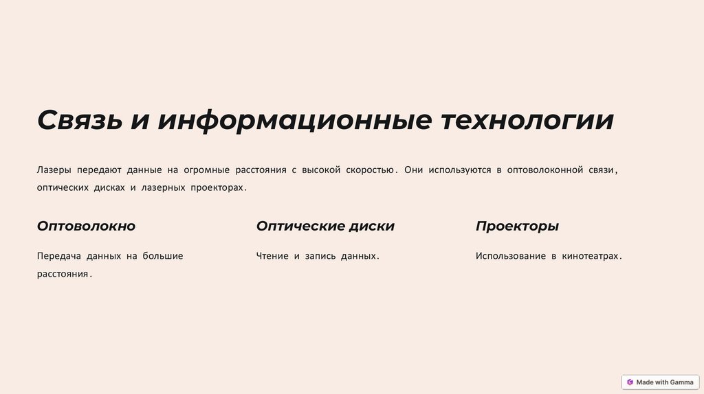 Связь и информационные технологииЛазеры передают данные на огромные расстояния с высокой скоростью. Они используются в оптоволоконной связи,