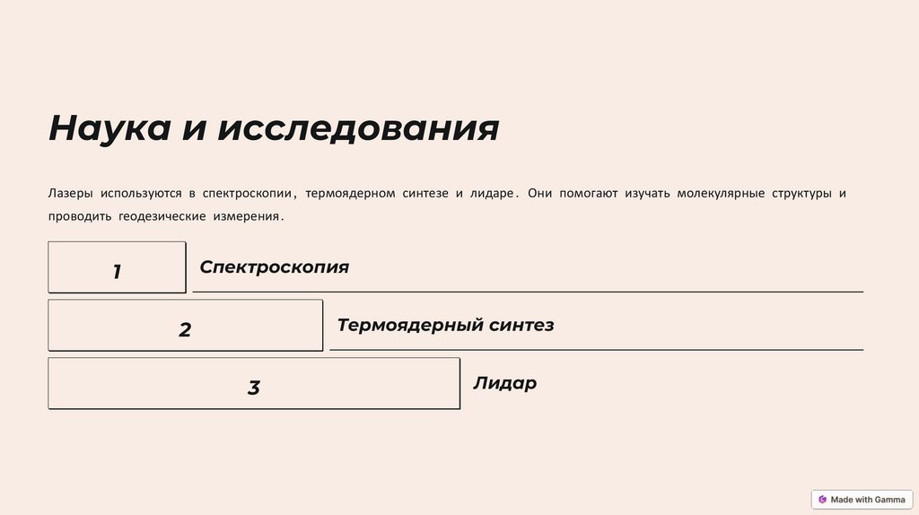 Наука и исследованияЛазеры используются в спектроскопии, термоядерном синтезе и лидаре. Они помогают изучать молекулярные структуры и