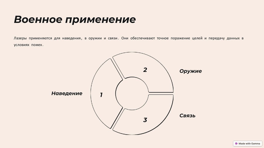 Военное применениеЛазеры применяются для наведения, в оружии и связи. Они обеспечивают точное поражение целей и передачу данных в