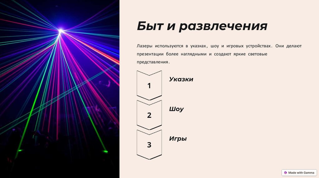 Быт и развлеченияЛазеры используются в указках, шоу и игровых устройствах. Они делают