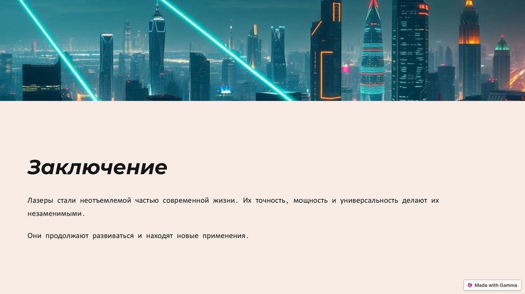 ЗаключениеЛазеры стали неотъемлемой частью современной жизни. Их точность, мощность и универсальность делают их