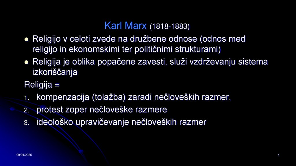 Karl Marx (1818-1883)Religijo v celoti zvede na družbene odnose (odnos med