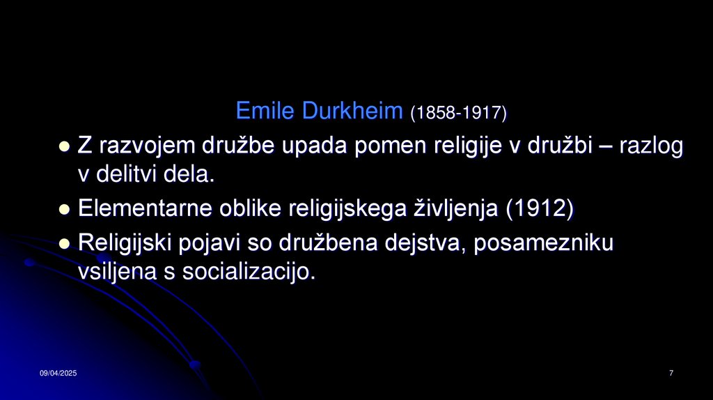 Emile Durkheim (1858-1917)Z razvojem družbe upada pomen religije v družbi – razlog