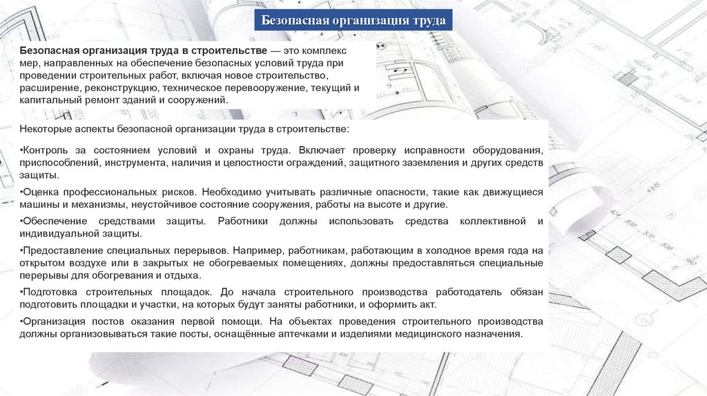 Безопасная организация трудаБезопасная организация труда в строительстве — это комплекс