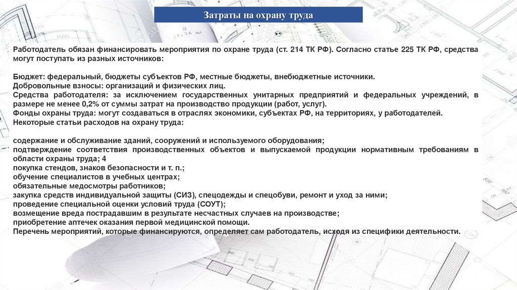 Затраты на охрану трудаРаботодатель обязан финансировать мероприятия по охране труда (ст. 214 ТК РФ). Согласно статье 225 ТК РФ, средства