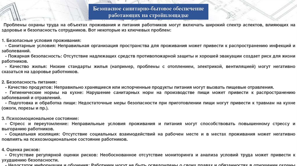 Проблемы охраны труда на объектах проживания и питания работников могут включать широкий спектр аспектов, влияющих на