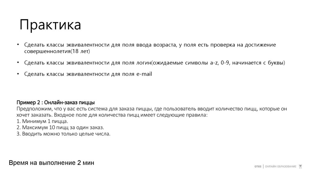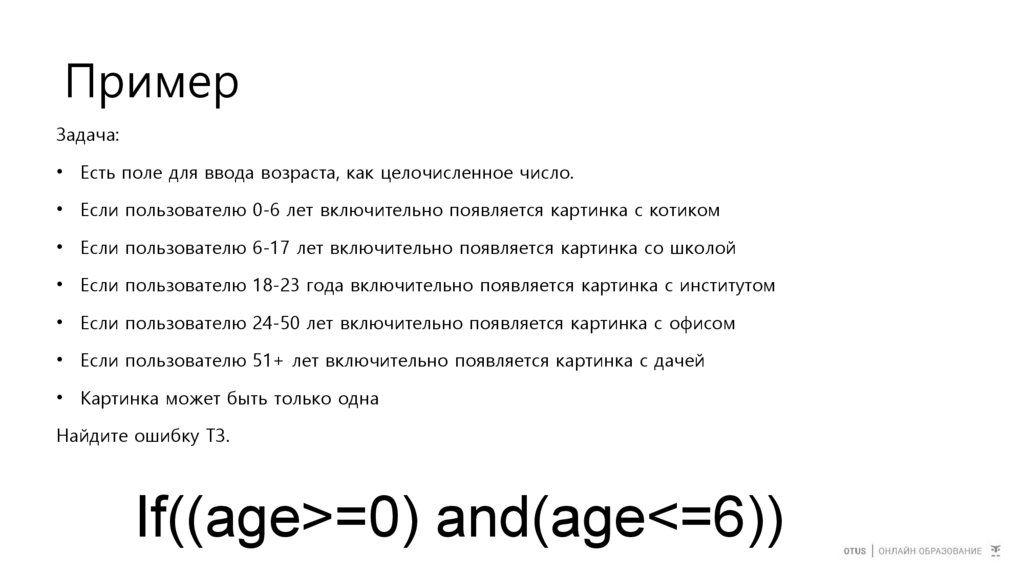 Практика• Сделать классы эквивалентности для поля ввода возраста, у поля есть проверка на достижение