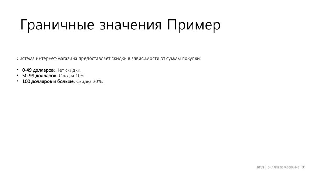 Граничные значения ПримерСистема интернет-магазина предоставляет скидки в зависимости от суммы покупки: