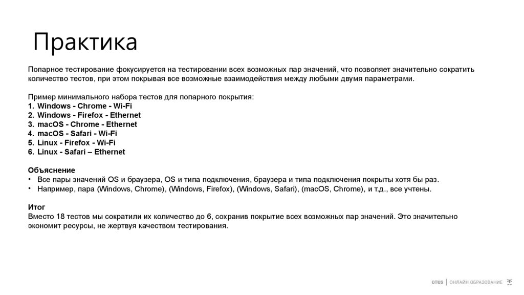 ПрактикаПопарное тестирование фокусируется на тестировании всех возможных пар значений, что позволяет значительно сократить