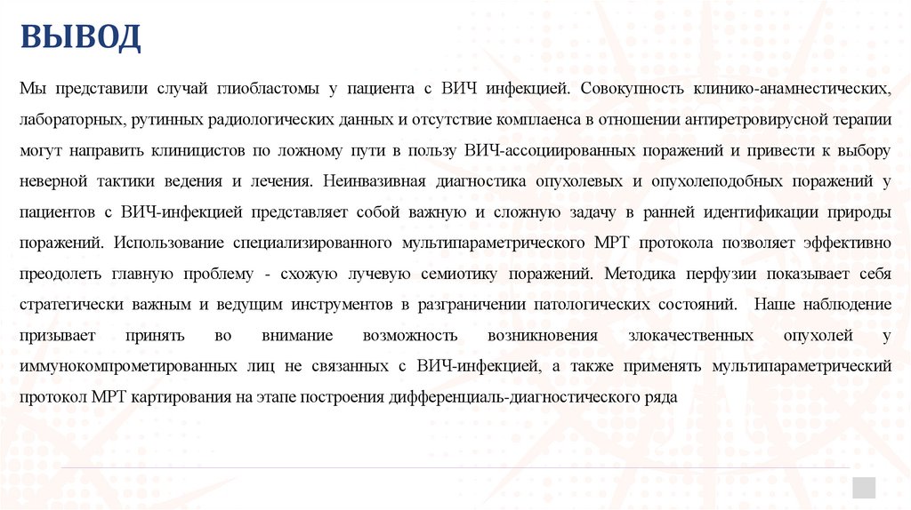 ВЫВОДМы представили случай глиобластомы у пациента с ВИЧ инфекцией. Совокупность клинико-анамнестических,