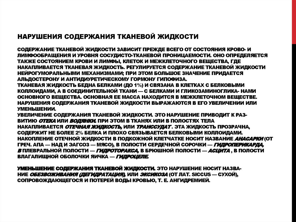 НАРУШЕНИЯ СОДЕРЖАНИЯ ТКАНЕВОЙ ЖИДКОСТИСОДЕРЖАНИЕ ТКАНЕВОЙ ЖИДКОСТИ ЗАВИСИТ ПРЕЖДЕ ВСЕГО ОТ СОСТОЯНИЯ КРОВО- И