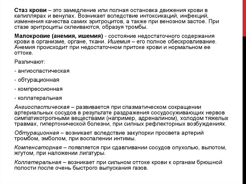 Стаз крови – это замедление или полная остановка движения крови вкапиллярах и венулах. Возникает вследствие интоксикаций, инфекций,