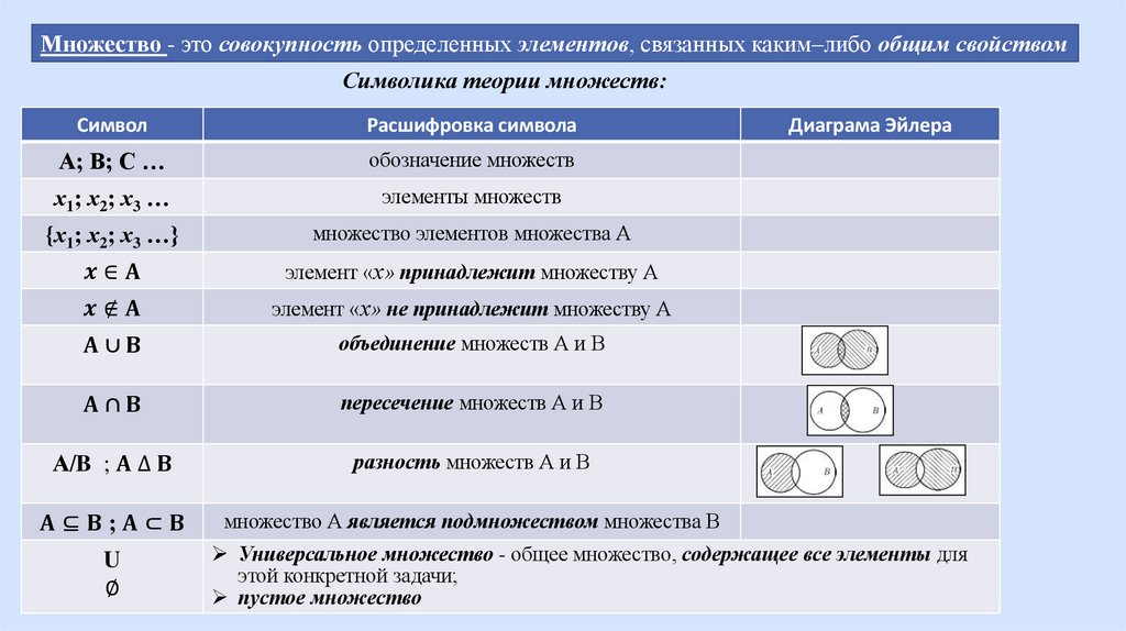 Множество - это совокупность определенных элементов, связанных каким–либо общим свойствомСимволика теории множеств: