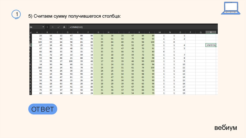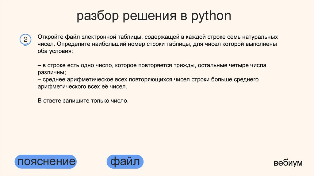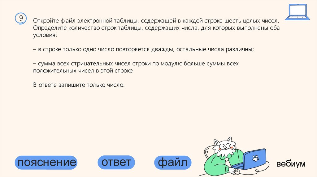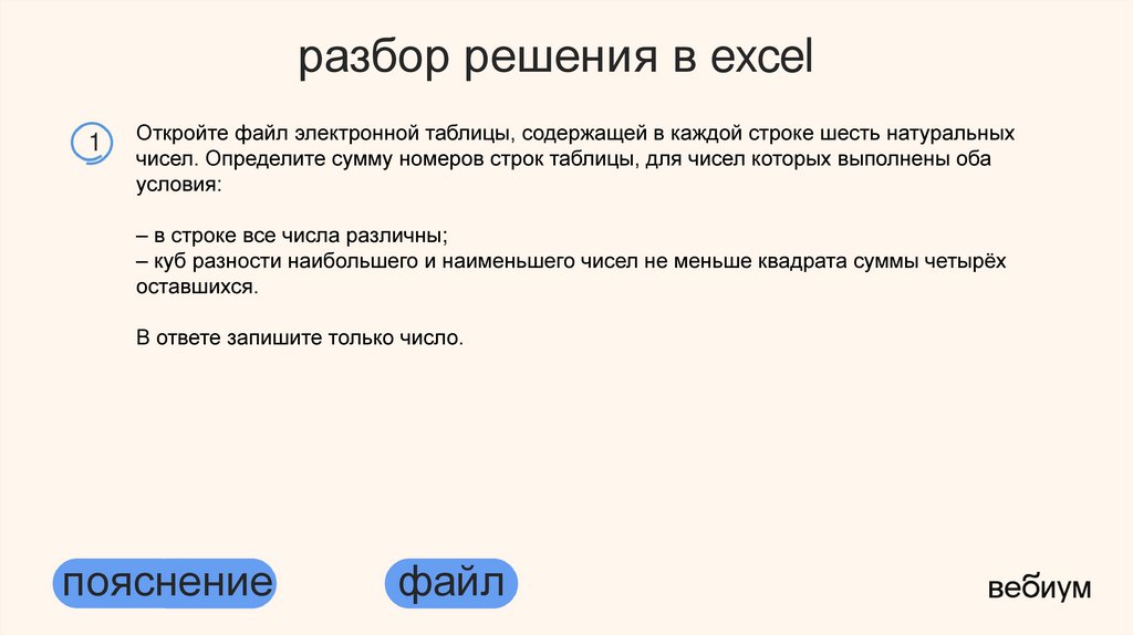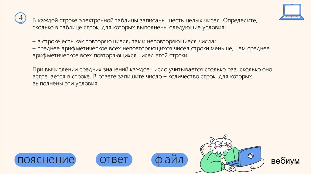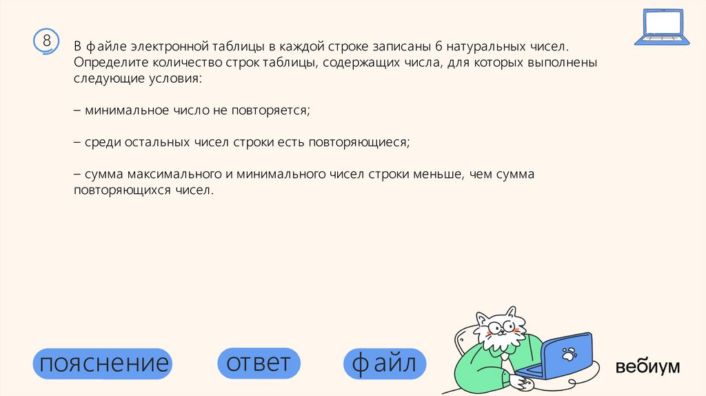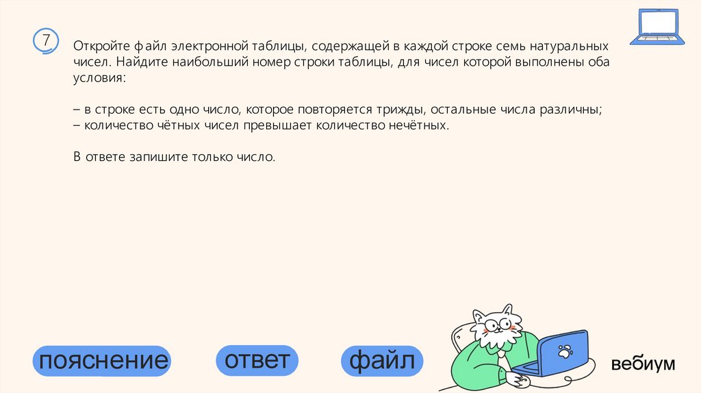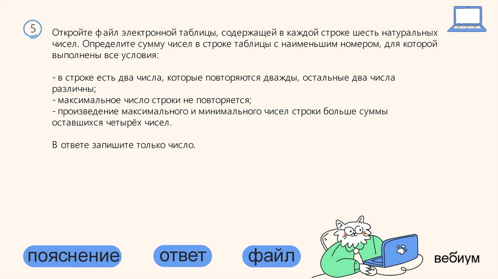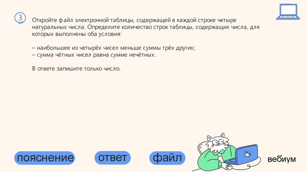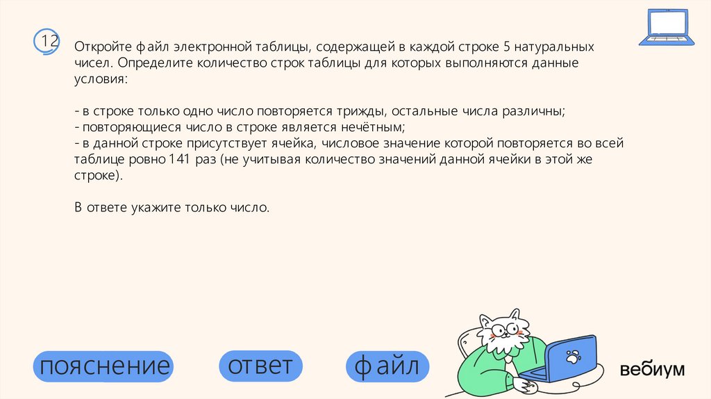 1 2 Откройте ф айл электронной таблицы, содержащей в каждой строке 5 натуральныхчисел. Определите количество строк таблицы для которых выполняются данные