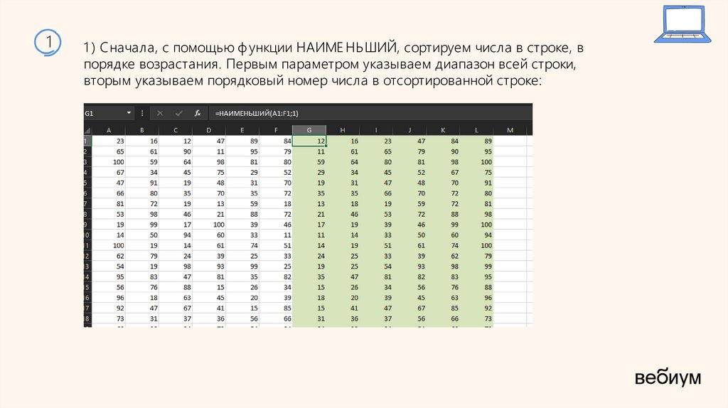11 ) Сначала, с помощью ф ункции НАИМЕ НЬШИЙ, сортируем числа в строке, в